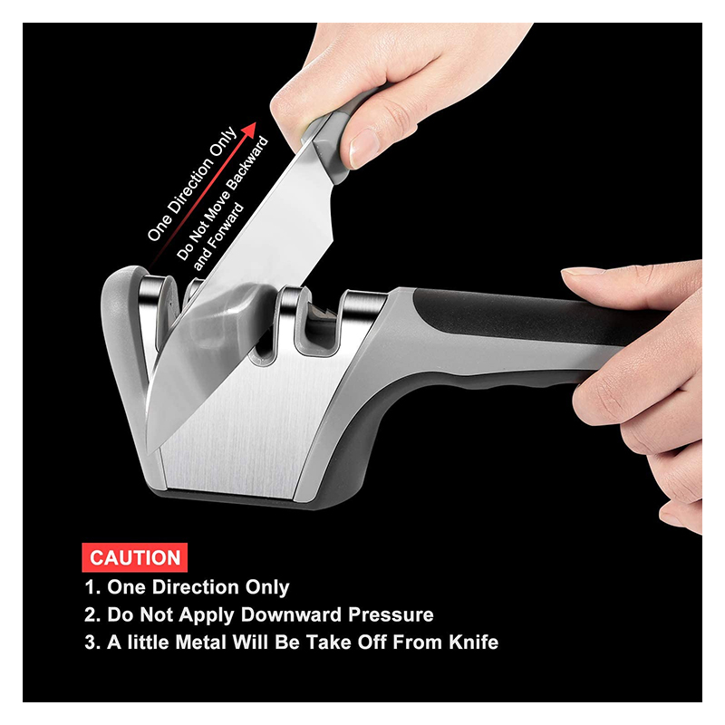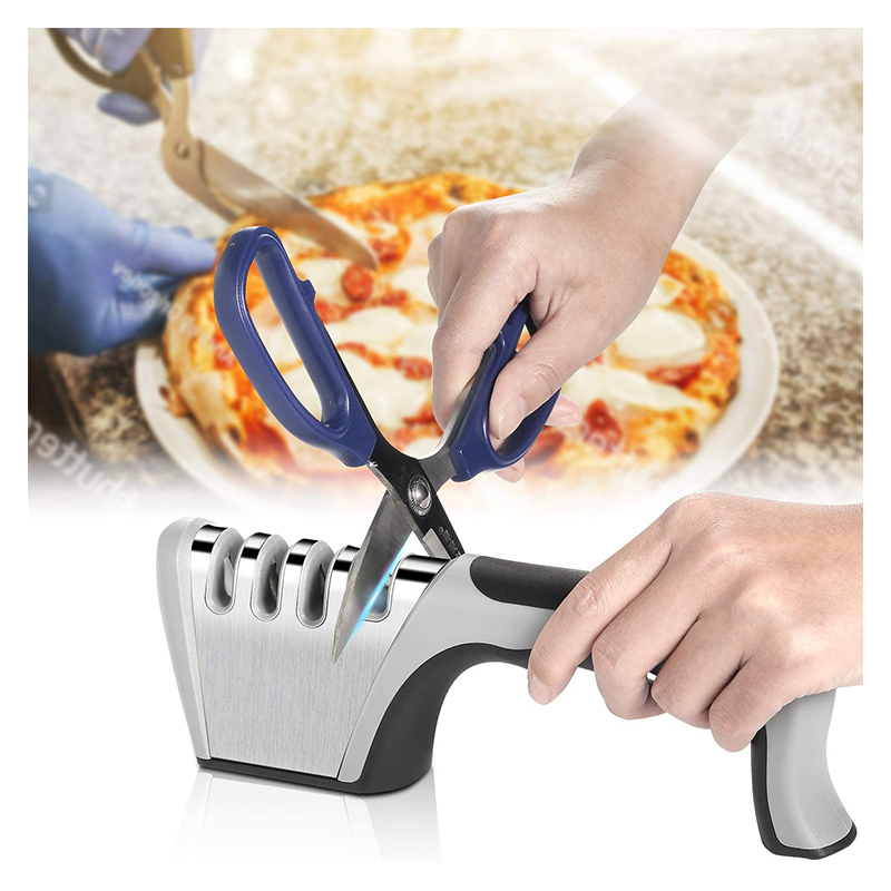 Upgrade 4 in 1. L aiguiseur comporte 4 compartiments, dont un pour ciseaux. 3 niveaux d’affutages manuel avec encoches à base de diamant, tungstène et céramique, adapté à tous les couteaux en céramique et en acier inox pour lui donner son profil tranchant après aiguisage .