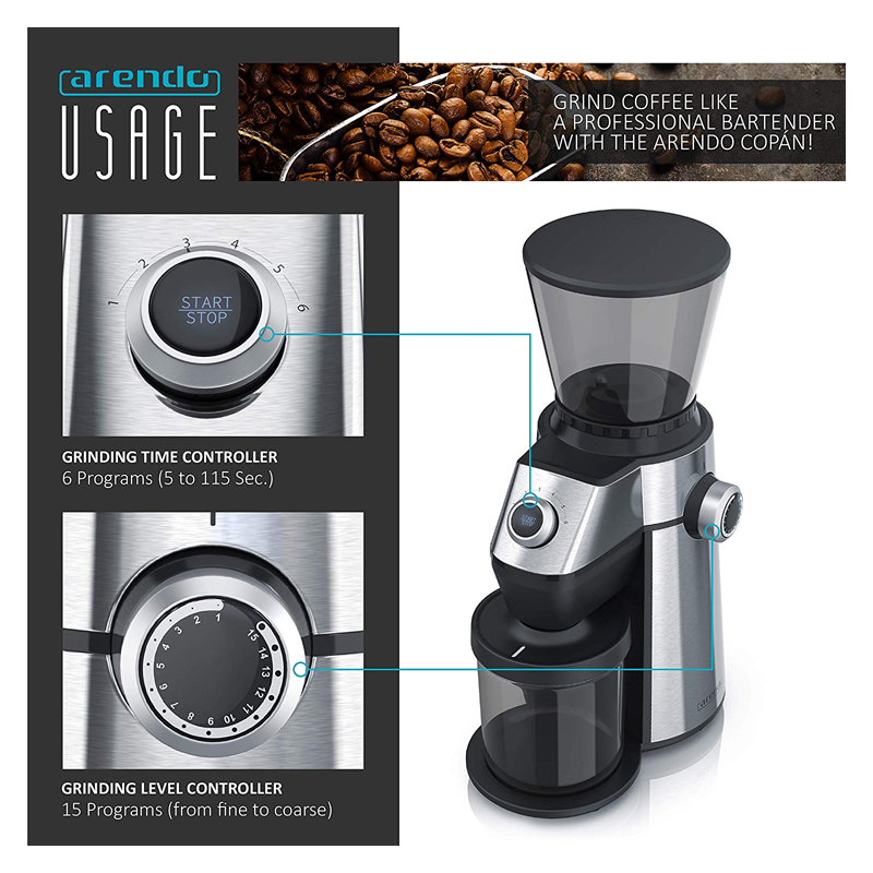 Enfin du café et Espresso frais ! Faites vous-même votre café et devenez votre propre maître. Avec le moulin à café en acier inoxydable Copán, vous pouvez vous-même moudre vos grains de café préférés. Avec une délicatesse et quasiment sans perte d’arômes grâce à un broyeur conique en rotation douce. | 303236