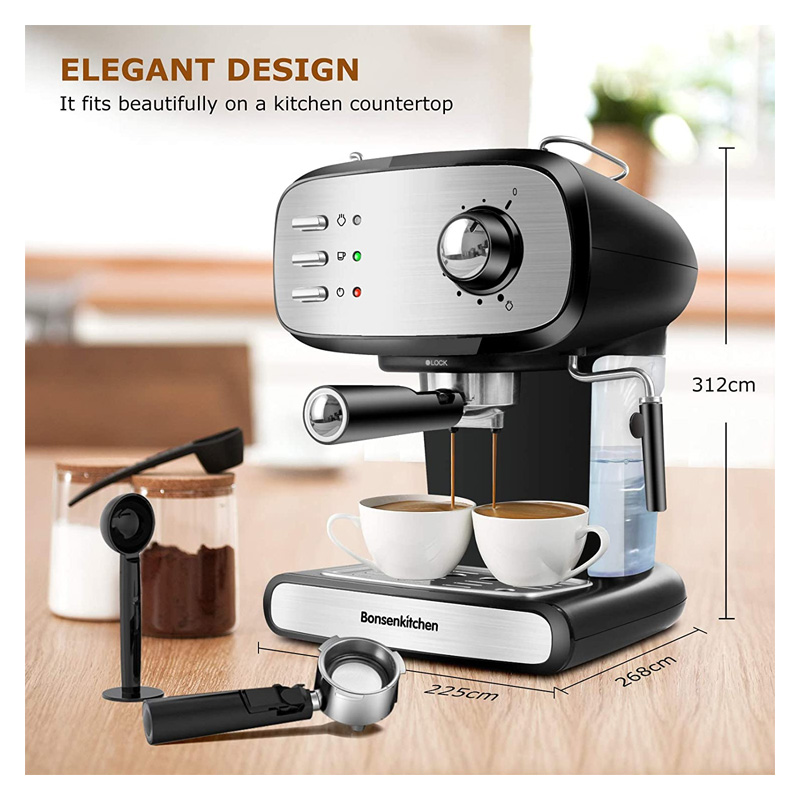 Bonsenkitchen,  machine à café haute performance en acier inoxydable 900W, machine à porte-filtre 15 bars pour expresso et cappuccino, 1 ou 2 tasses (1,2L)