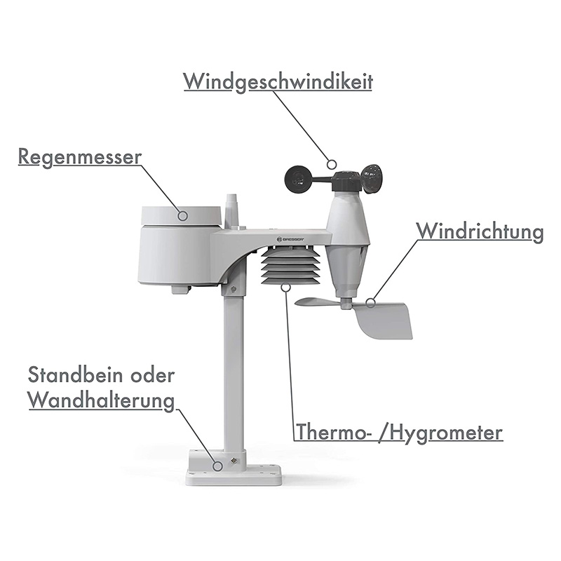 Nombreuses fonctions – Outre les valeurs mesurées, la station météo sans fil 5 en 1 propose: alarme/réveil, alerte de gel/verglas, réglage radio-piloté de l’heure et de la date (DCF), affichage des phases lunaires actuelles et prévisions à 12 heures