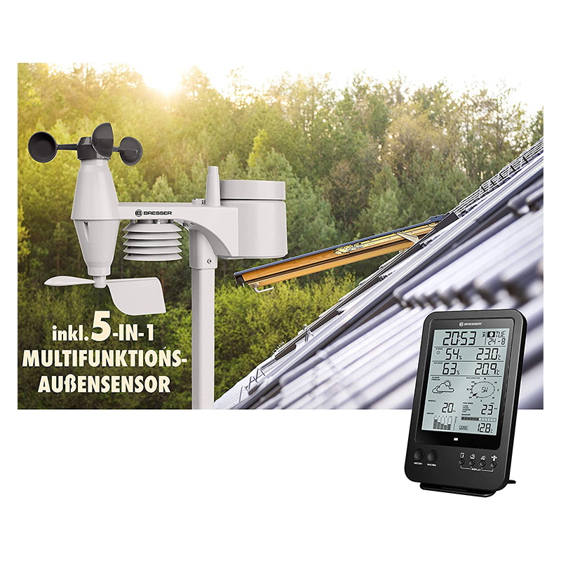 Bresser station météo radio avec capteur extérieur 5-en-1 (écran 14 cm, capteur extérieur pour température, humidité, pression atmosphérique, vitesse et direction du vent et pluviomètre) noir