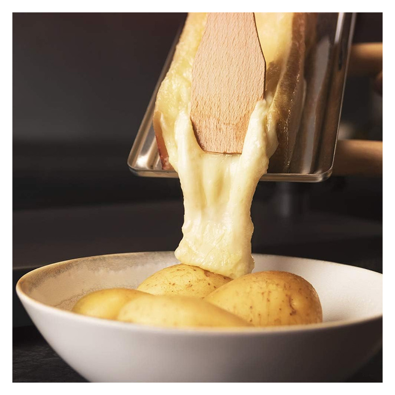 Le matériau du gril est anti-adhérent, pour le nettoyer plus facile et rapidement. De plus, possède une poignée giratoire et inclinable pour que vous ajustez la hauteur de la raclette. Inclut aussi un support amovible pour le fromage avec deux poignées en bois.