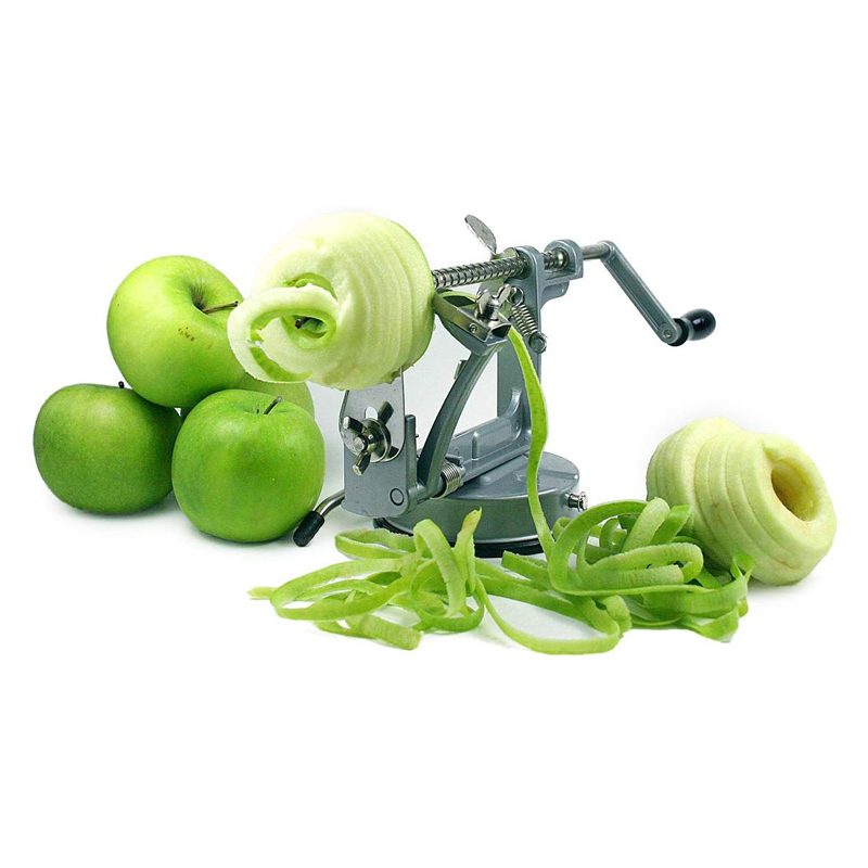 Le coupe-pomme crée des tranches ou des spirales d’épaisseur réglable. Polyvalent : pommes, poires, pommes de terre, radis. Le vide-pomme est aussi un vide-pomme.