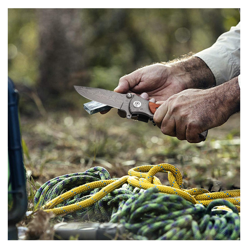 GVDV Couteau Pliant Poche avec Pierre à Aiguiser – Couteau Pliable de Survie Chasse en Acier Inoxydable 7Cr17, Lame Revêtue de Titane, Poignée en Bois, Blocage de Sécurité, Boucle de Ceinture