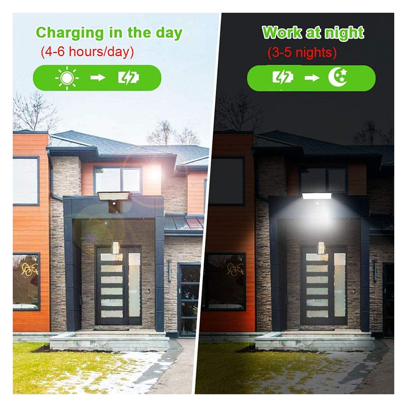 Super Bright & High Efficient Solar Panel:Designed avec 90 LED haute puissance et une puce de gestion de l’énergie, la lumière solaire fournit un excellent éclairage, qui est beaucoup plus lumineux que d’autres lampes similaires. le panneau solaire absorbe et convertit les rayons du soleil en électricité et les stocke dans la batterie rechargeable de 2600 Mah. cette lampe solaire murale extérieure peut fonctionner 4-5 nuits par temps de pluie. parfaite pour une utilisation sur la porte d’entrée,