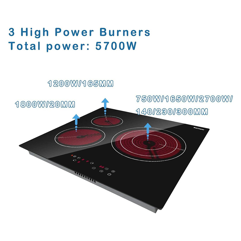 Karinear Plaque de cuisson en céramique intégrée 3 feux, Table de cuisson électrique en verre cristal noir avec commande tactile, Minuterie, verrouillage pour enfants, 5700 watts