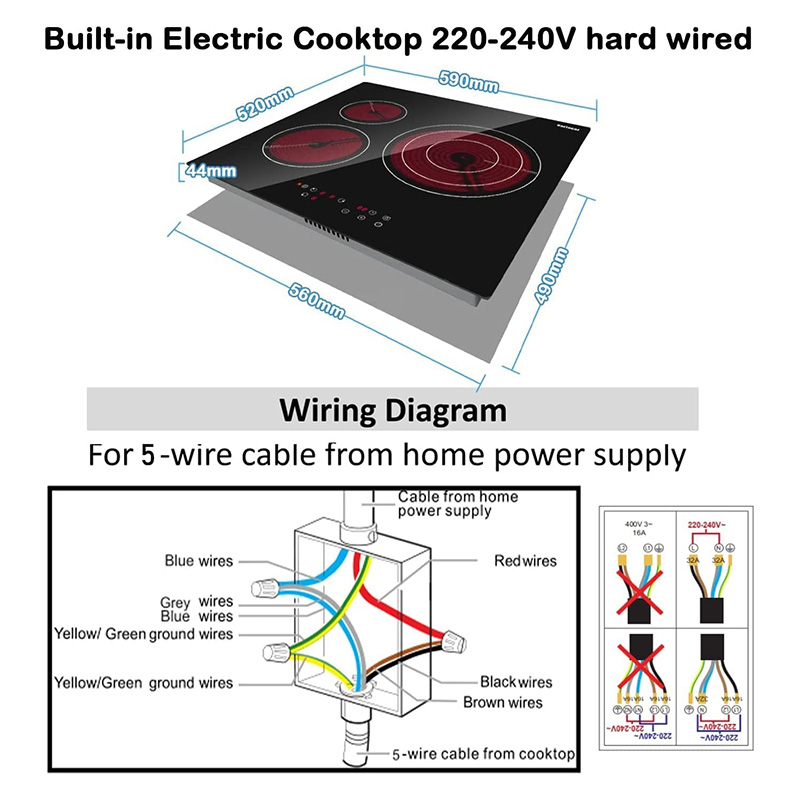 ADAPTÉ À TOUS LES PRODUITS DE CUISSON – Fer, aluminium, céramique, acier inoxydable, cuivre, verre résistant à la chaleur – aussi longtemps qu’une casserole. Forfait comprend 1 cuisinière en céramique à 3 zones, 1 manuel de l’utilisateur, 1 câble d’alimentation à 5 conducteurs de 1, 2m, 1 grattoir.