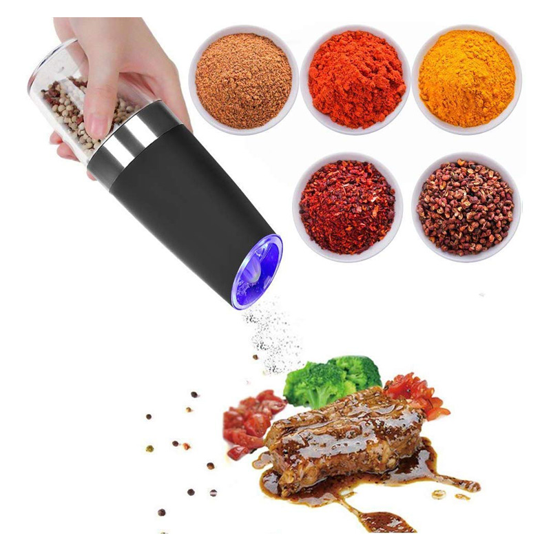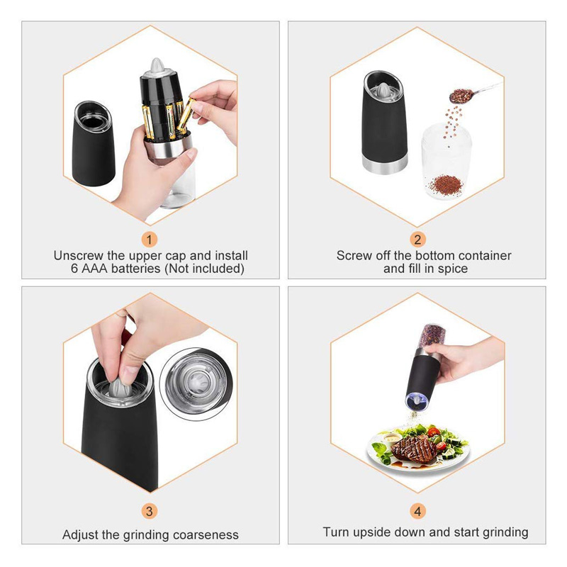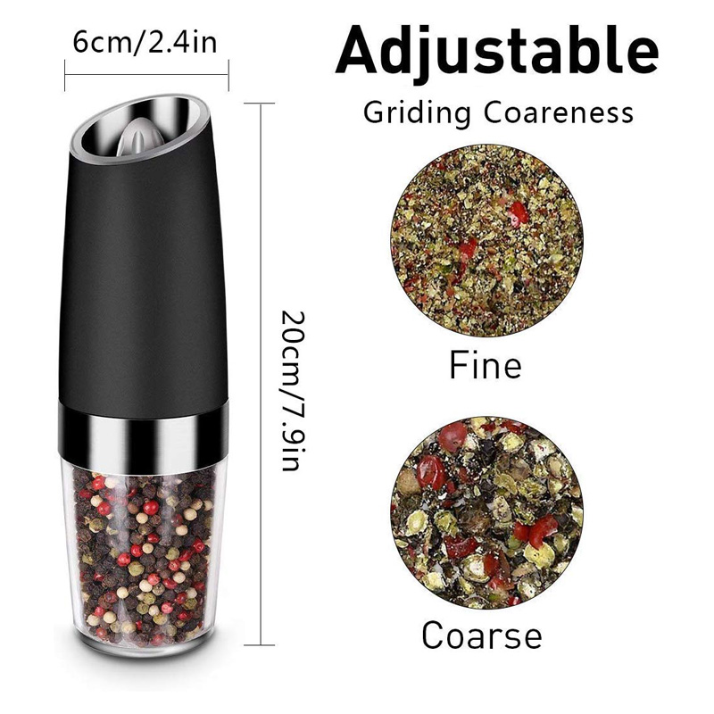 - Commutateur De Gravite. Moulin à sel et Poivre inclinez simplement le moulin à sel, la LED bleue s’allumera automatiquement, activez le moulin à épices pour qu’il fonctionne. Peut être Ajusté. Moulin à Poivre Sel et Poivre tournez le bouton situé en haut à gauche et à droite et ajustez la taille du grain en fonction du plat et affinez-le à votre rugosité préférée. Facile À Vérifier. Adopte la résine ABS transparente et il est plus facile de vérifier et de reconstituer la quantité restante de grain et de poivre en un coup d’œil. Lorsque vous inclinez l’unité principale, la lumière s’allume automatiquement, ce qui vous permet de saisir plus facilement la quantité de poivre que vous mettez dans l’obscurité. Alimenté Par Batterie. Ce moulin à sel et à poivre nécessite 6 piles AAA. Un design simple et tendance, adapté à toutes les tables de repas et les comptoirs de cuisine, peut être utilisé pour le pique-nique en plein air et le camping. Largement Utiliser. Le moulin à sel et à poivre peut facilement broyer les sels de mer, le poivre, les flocons de piment rouge, les grains de poivre blanc et autres épices.