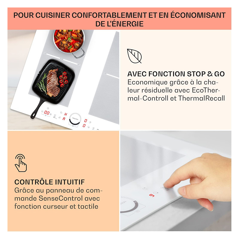 COMMANDE TACTILE INTELLIGENTE: Une utilisation facile de la plaque induction 4 feux grâce aux commandes tactiles et à l’affichage numérique par la technologie SenseControl. Cette technologie permet un contrôle des divers réglages de cuisson.
