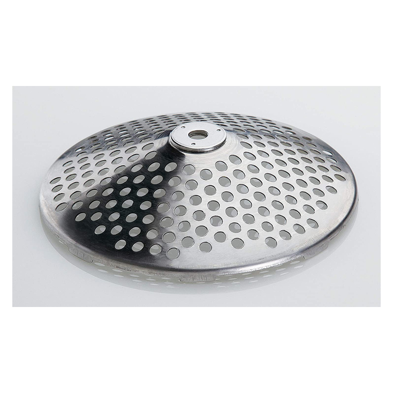 Moulin à Légumes Inox livré avec 4 grilles avec des trous de 1.3 à 5 mm pour utilisation mixte, légumes et fruits. Passe au lave-vaisselle sans problème.