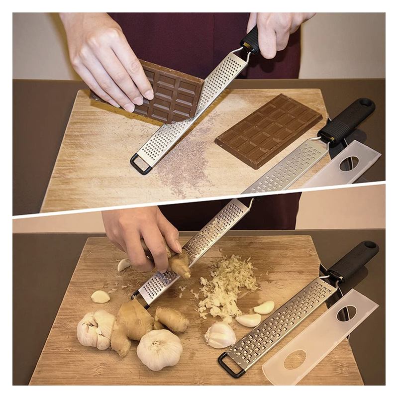 ➊ Conception Polyvalente – La râpe de haute qualité est l’un des outils les plus durables de la cuisine. Vous pouvez l’utiliser pour broyer une variété de fruits et de légumes tels que citron, bigarade, agrume, parmesan, fromage, épices, noix de muscade, cannelle, chocolat, etc… Vous pouvez également l’utiliser pour enlever les bords grillés des biscuits et du pain. Si vous avez besoin de gingembre ou d’ail fraîchement moulé pendant la cuisson, vous pouvez utiliser cet outil.