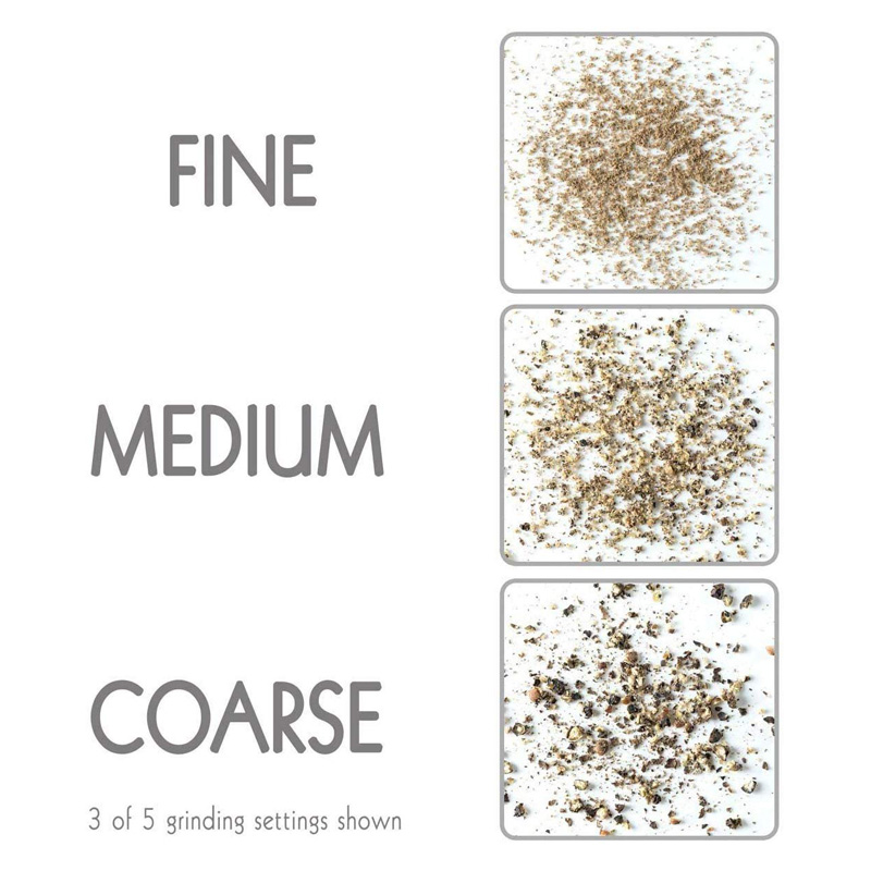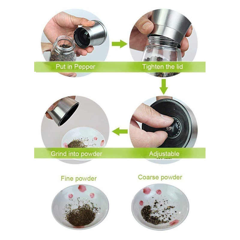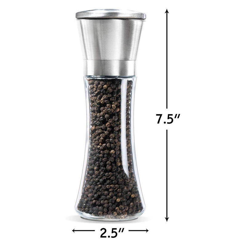 • Parfait pour tous les types de sel et de poivre, préserver la fraîcheur de vos épices pour tous vos repas. Le rotor en céramique de haute qualité, réglable en cinq niveaux allant de grossier à fin, garantissent un degré de moulure de vos condiments atteignant la perfection. Moderne et unique, notre Jeu de moulin à sel et à poivre en acier inoxydable et verre, design sobre et élégant sur votre table qui charmera toujours votre famille et vos invités. Préserver la fraîcheur de vos épices préférés avec ce moulin à sel et à poivre hermétiquement fermé. Ils contiennent un couvercle d’étanchéité parfaitement fixé pour préserver vos épices moulues fraîches, exemptes d’humidité et de poussière ainsi que de résidus disgracieux. Le moulin Dimensions 7.5 in de haut sur 2.5 in de large et vous avez une capacité de 3/4 cup pour votre baie poivre, sel de mer, sel casher, sel de l’Himalaya, épices et plus. Ces moulins ne sont pas livrées remplies d’épices. Remplissez le avec les épices de votre choix.