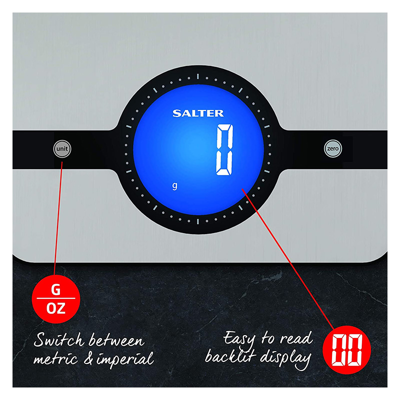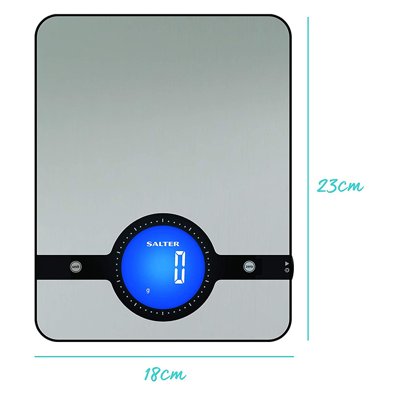 Salter Balance de Cuisine digitale grand écran Geo – Balance en acier inoxydable, écran LCD, compact, nettoyage facile – Garantie de 15 ansInclut des boutons plus sensibles pour une utilisation plus rapide sur la plateforme