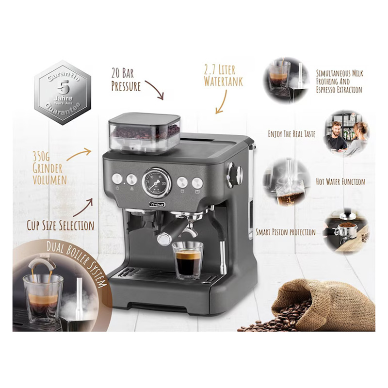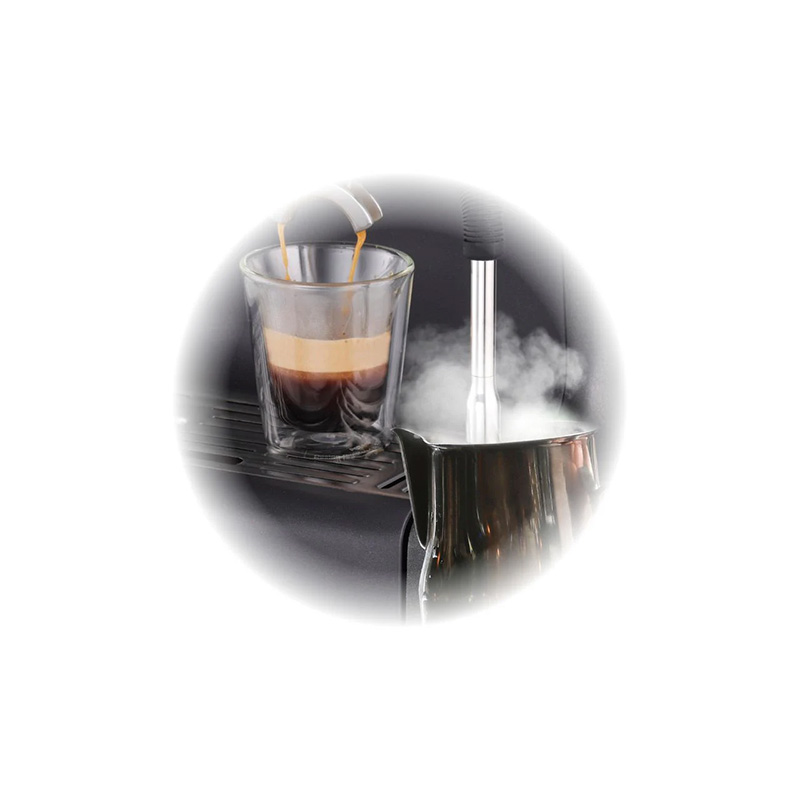 Machine expresso, porte-tamis, interrupteur marche/arrêt, pression de la pompe 20 bars, cuve à grains 350 gr, cuve à eau 2,7 L, détachable, buse eau chaude/vapeur