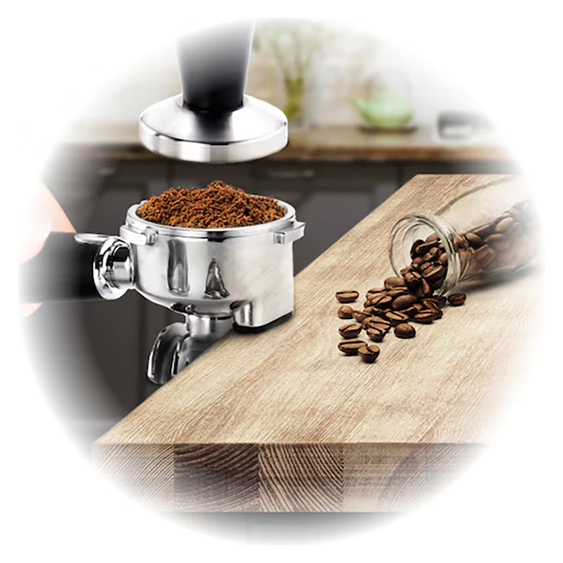 porte-tamis, interrupteur marche/arrêt, pression de la pompe 20 bars, cuve à grains 350 gr, cuve à eau 2,7 L, détachable