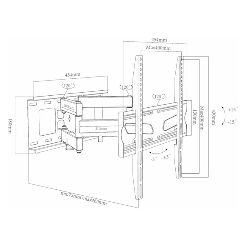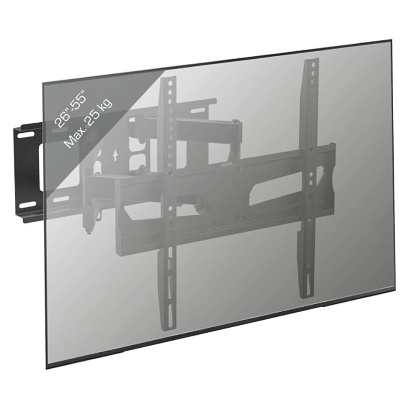 66 cm, 26 pouces, 139 cm, 55 pouces, charge jusqu’à 25 Kg, norme VESA, Inclinaison 15 degrés, pivotant, 2 articulations