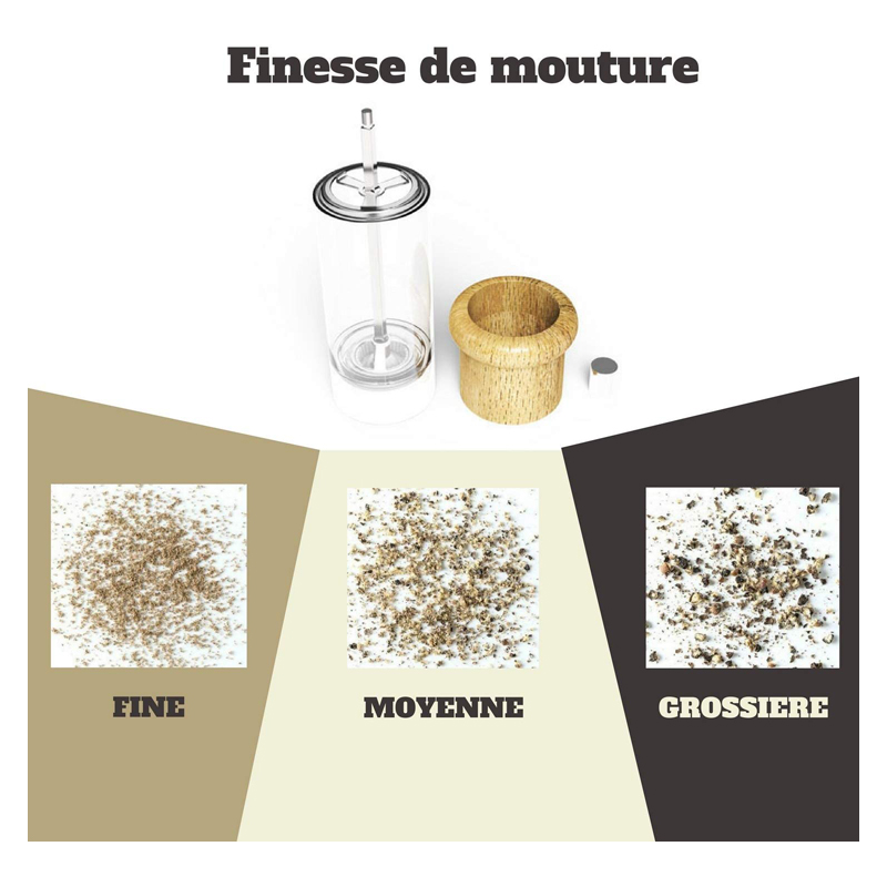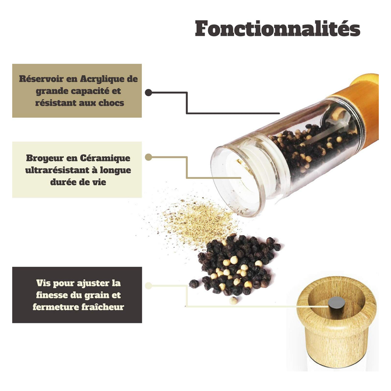 - LE GOUT ET LA SANTE DANS L’ASSIETTE : Les épices en grains sont des concentrés d’arômes et de principes actifs qui conservent longtemps leur précieuses essences. Avec le moulin à épices Himalaya devenez un magicien (une magicienne) en cuisine ! Libérez les goûts et les parfums des épices pour métamorphoser vos plats selon vos envies et selon vos besoins ! C’est simple ! D’un tour de moulin vous ramenez des saveurs, des couleurs et des textures dans l’assiette. FONCTIONNALITES PROFESSIONNELLES : Ne ratez plus jamais de plat à cause d’un mauvais assaisonnement ! Avec le moulin Himalaya vous avez le contrôle ! La vis centrale vous permet de régler la finesse de la mouture pour une expérience gustative d’une extrême précision. Vous pourrez ainsi adapter votre assaisonnement à vos plats ainsi qu’à vos envies. De plus, vous obtenez un calibrage parfait de la mouture pour un résultat uniforme à chaque tour de moulin et des plats réussis à tous les coups ! MATERIAUX NOBLES, HAUTE QUALITE : Comme tous les moulins VeoHome, le moulin à épices Himalaya est doté d’un mécanisme de broyage en céramique, plus dur que l’acier. C’est notre marque de fabrique et nous le GARANTISSONS A VIE ! Contrairement aux moulins en verre, le réservoir est réalisé en acrylique très résistant aux chocs et d’une grande durabilité. La partie supérieure est en bois noble, d’une belle couleur claire et texture veinée qui apporte du style et de l’élégance à l’ensemble. ECONOMIQUE et ECOLOGIQUE : En achetant le Moulin à épices Himalaya, vous prenez le parti de la protection des ressources et de l’environnement. Comment ? En consommant les épices de façon raisonnée, sans gaspillage (moudre au fur et à mesure de ses besoins) ; En évitant les emballages superflus (pots d’épices avec broyeur intégré jetables, sachets plastiques, etc.) et en achetant les épices en vrac (moins chères) et en plus grande quantité vu leur meilleure conservation.